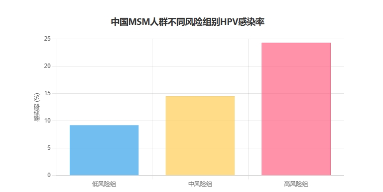 - 男男性行为者(MSM): 由于生理结构和行为因素,MSM人群感染HPV的概率显著升高。研究显示,MSM的肛门HPV感染率远高于异性恋男性。例如,一项针对中国MSM人群的研究报告了不同风险组别的HPV感染率,具体数据如上图。